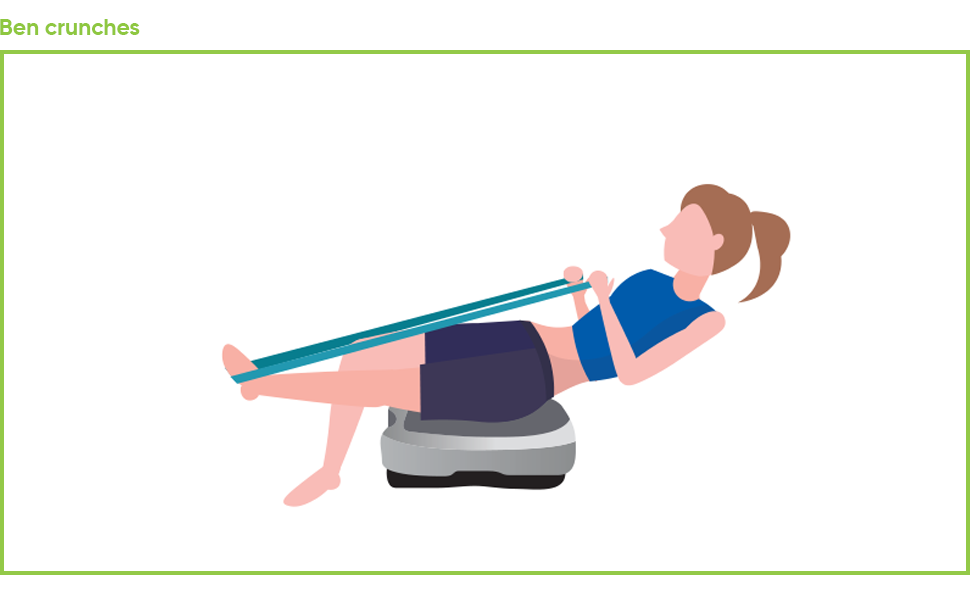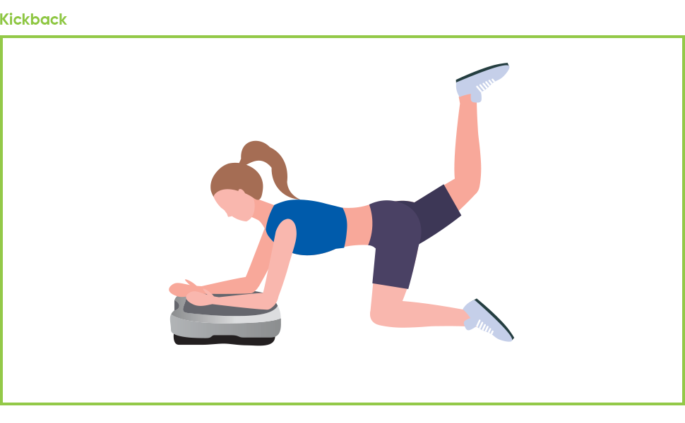 Sådan gør du: Placer dine underarme på vibrationstræneren og dine knæ på gulvet. Sæt håndtaget på modstandsbåndet på en af dine fødder. Stræk dit ben bagud og spænd din bagdel. Gentag øvelsen med andet ben efter 30 sekunder.