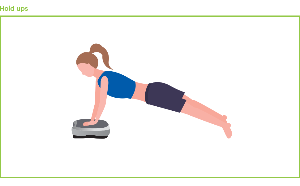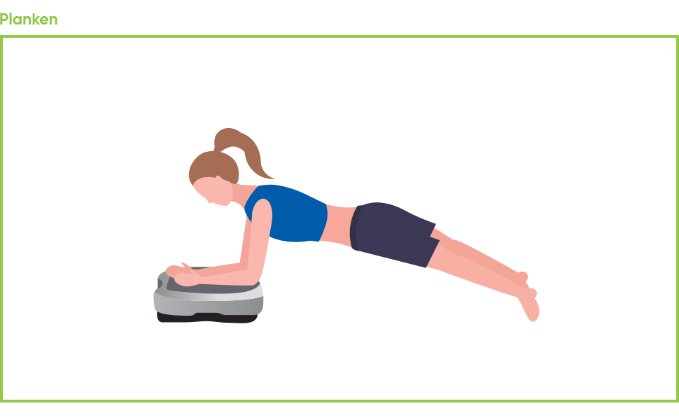 Sådan gør du: Hvil albuerne på vibrationstræneren med adskilte albuer i skulderbredde. Hænderne må ikke røre hinanden, og resten af kroppen skal være løftet over gulvet. Ryggen skal være lige, og baller og mave skal være spændte. For at gøre det lettere kan du hvile knæene på gulvet.
