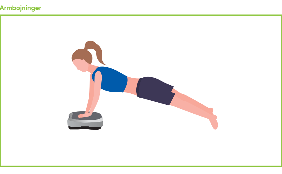 Sådan gør du: Placer dine hænder på pladen med hænderne lige under skulderhøjde og lidt bredere end skulderbredde. Støt på tåspidserne. Eventuelt støt på knæene for at gøre det nemmere. Ryggen skal være helt ret og lige.