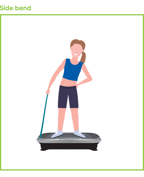 Sådan gør du: Stå på vibrationspladen med den ene arm på hoften og bøj nu overkroppen mod den side. Vend derefter tilbage til udgangspositionen og gentag bevægelsen. Gentag med anden hånd efter 30 sekunder.