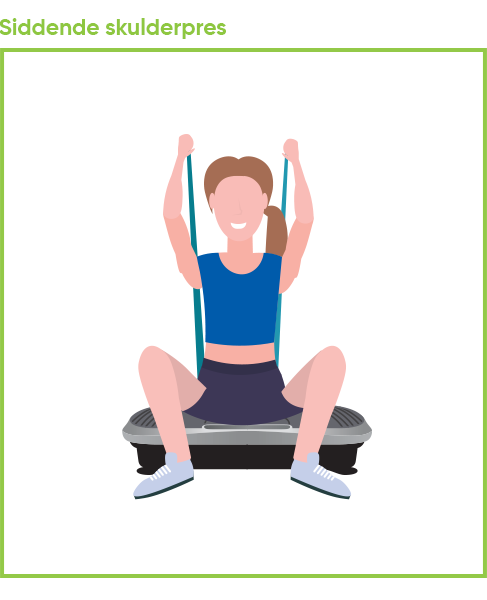 Sådan gør du: Sæt dig på vibrationstræneren. Kryds modstandsbåndene bag din ryg. Løft fødderne fra gulvet og læn dig let tilbage. Hold maven stram, mens du fører hænderne sammen over hovedet og vend derefter tilbage til startpositionen.