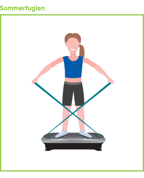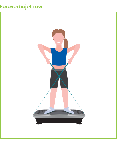 Sådan gør du: Stil dig på vibrationstræneren med lettere adskilte fødder. Hiv op i modståndsbåndene, indtil dine hofter danner en ret vinkel med dine albuer. Træk dine skulderblade så langt tilbage som muligt og hold denne position.