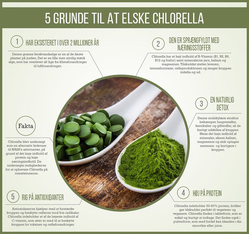Undersøgelser har vist, at en chlorella kur gavner hele kroppen ved at støtte en sund hormonal funktion, god hjerte-kar-sundhed, er med til at reducere bivirkningerne af kemoterapi og strålebehandling, sænker blodtrykket og kolesterol, og hjælper med at udrense og afgifte vores kroppe. Den rige grønne farve stammer fra den høje koncentration af klorofyl. Vi får alle besked på at spise mere frugt og grøntsager til et godt helbred, men nogle gange kan det være svært at få de anbefalede 500 gram eller 5 stykker frugt om dagen, som det anbefales af ernæringseksperter.