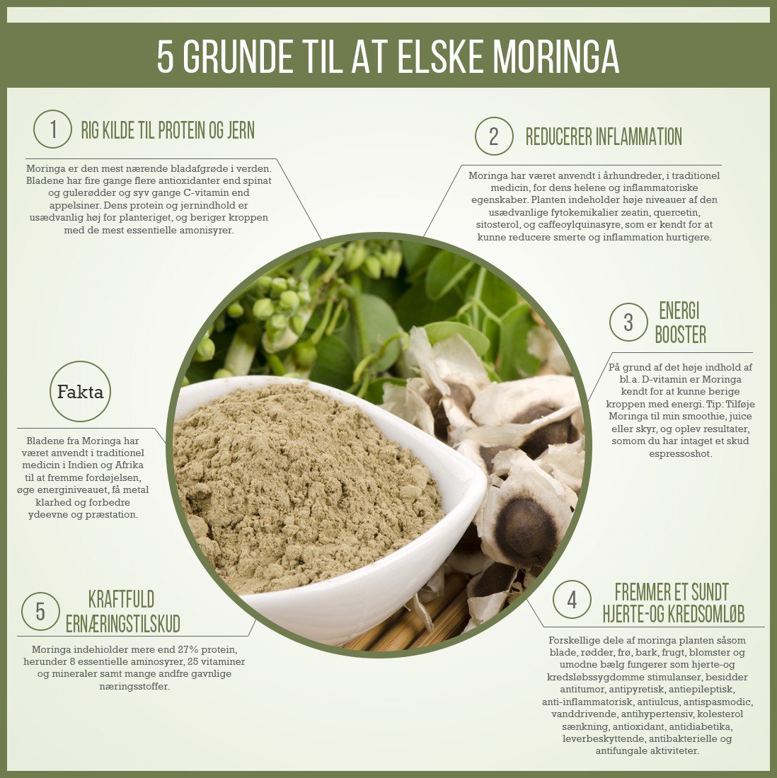 Moringa er et naturligt superfood fyldt med vitaminer, proteiner, jern og antioxidanter. En af de mest næringsrige fødevare på planeten. Med vores produkter tilbyder 100% økologi, så der ingen fyldsstoffer, tilsætningsstoffer, konserveringsmidler er tilføjet således, at vores produkter bibeholdes rig på sine fantastiske næringsstoffer. Dette superfood er højt værdsat for sine medicinske egenskaber gennem tider. Den grønne superfood er fremstillet af naturligt tørrede blade fra moringa træet. Det er ikke tilfældigt at man kalder træet for The Miracle Tree.