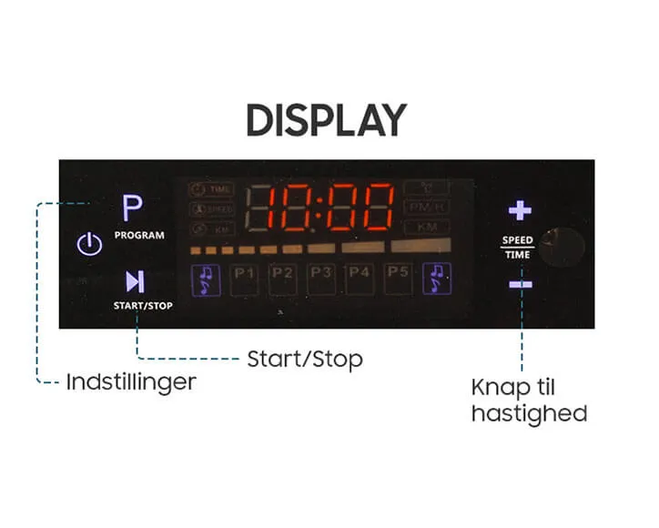 3. Vælg program Brug “Vælg Program”-knappen til at skifte mellem de forudindstillede træningsprogrammer (markeret med “P”). Når du har valgt et program, starter du træningen ved at trykke på “Start”-knappen. Bemærk, at tid og intensitet ikke kan justeres i de forudindstillede programmer (se gennemgang af programmerne længere nede).