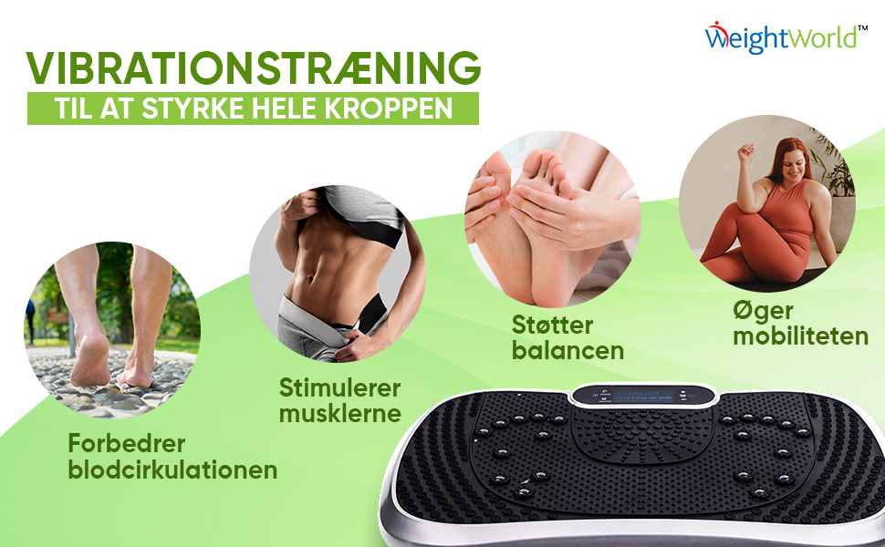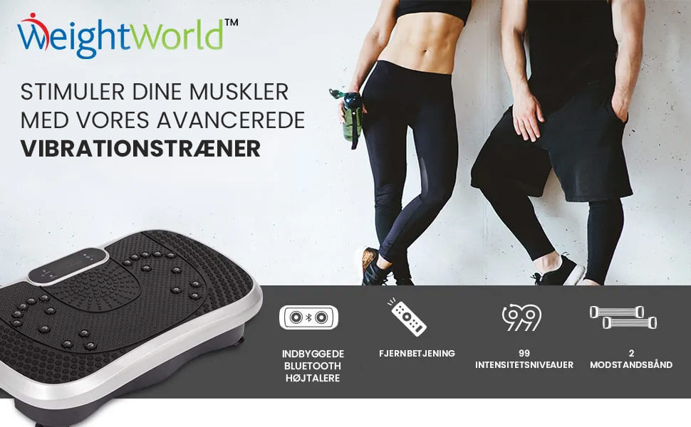 Med WeightWorlds vibrationstræner får du en alsidig træningsmaskine, der leveres med en praktisk fjernbetjening, indbygget bluetooth-højttaler til musik under træningen samt 5 træningselastikker. På den måde kan du nemt træne hele kroppen på blot 15 minutter om dagen.